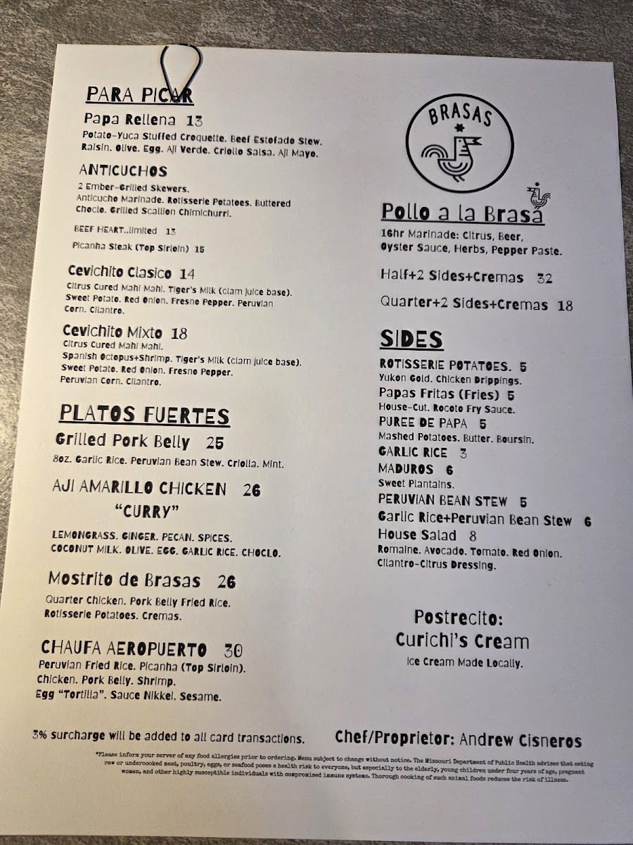 “ We had a great meal at Brasas STL, right across from the Pageant. The space is small—just five tables inside and two outside—but clean and contemporary. There was one staffer working as hostess, server, and bartender, but she hustled and handled it all well. We had the Pollo a la Brasas with roasted potatoes and plantains, and the Mostrito de Brasas over pork belly fried rice. All the main dishes had a moderate kick to them. Everything was excellent, but the pork belly rice and sweet plantains were the real standouts. Despite being seated at the bar even with a reservation, we really enjoyed our visit. The food is flavorful, moderately spicy, and well-priced. ”